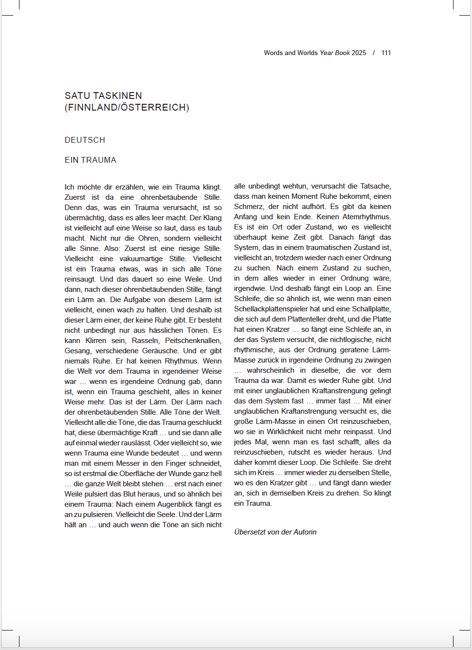 EIN TRAUMA. Auszug aus dem Roman Rakastan vierasta (Ich liebe das Fremde), Teos 2026. Magazin Words & Worlds, Jahrbuch 2025.